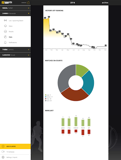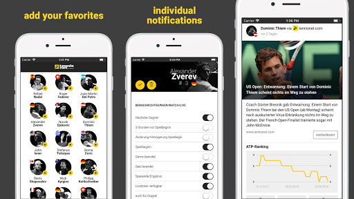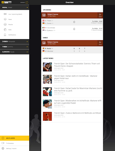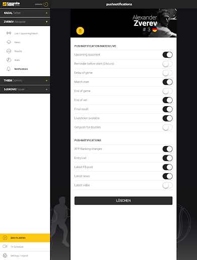 Because of the Livesticker/Live-Score your are up to date when your tennis players like Roger Federer, Rafael Nadal, Alexander Zverev, Dominic Thiem or Novak Djokovic are on the court.