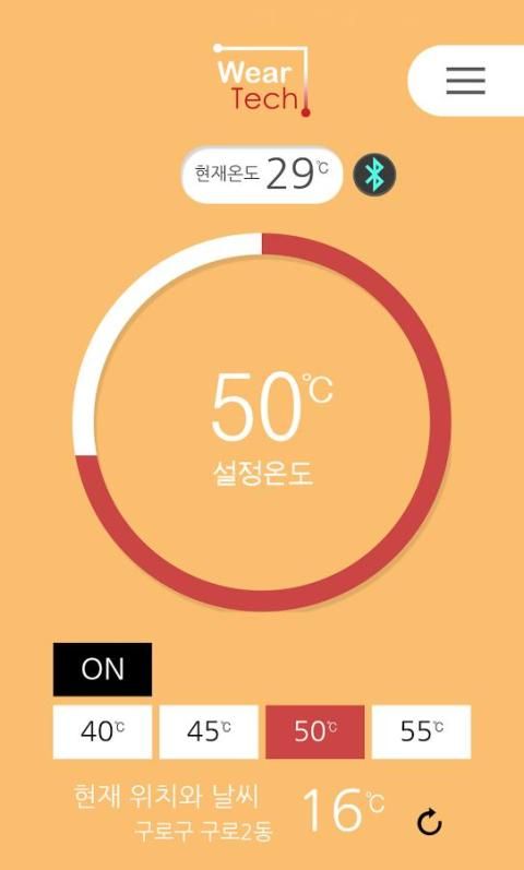 Wear Tech (warehouse Tech) application for, clothes inside temperature and using a smartphone so you can select the temperature step by step the heating pad attached to the garment features that users are automatically adjusted to maintain the desired temperature and the user's location, area is an application that provides temperature information.