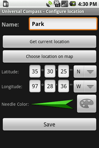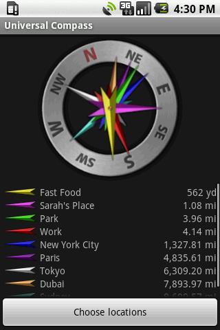 Universal compass lets you point to anywhere you want.DEMO: You can39;t save locations features use current pos., select it on a map or enter coordinates point to as many locations as you want tries to use gps when a location is closer than 10 miles, uses network otherwise includes widget tap to turn onoff