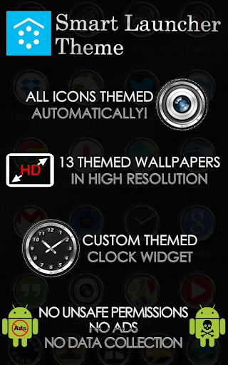 Smart Launcher theme. Extremely detailed and high quality elegant and modern Smart Launcher theme with high definition graphics auto-themed icons, 13 custom themed HD wallpapers, and a metal clock widget, to give very detailed and defined graphics even in devices with the highest resolution screens. Everything is themed to the last detail, using metallic textures, lighting effects, reflections and gradients to give a great contrast and quality look.