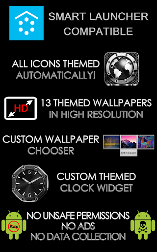 Smart Launcher theme. Extremely detailed and high quality elegant and sporty Smart Launcher theme with high definition graphics auto-themed icons, 13 custom themed HD wallpapers, and a metal clock widget, to give very detailed and defined graphics even in devices with the highest resolution screens. Everything is themed to the last detail, using metallic textures, lighting effects, reflections and gradients to give a great contrast and quality look.