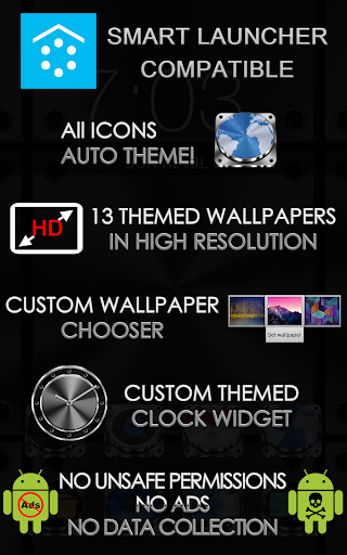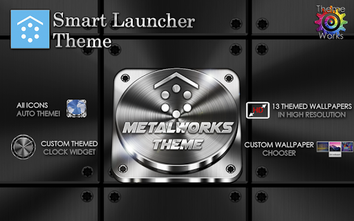 Smart Launcher theme. Extremely detailed and high quality elegant and modern Smart Launcher theme with high definition graphics auto-themed icons, 12 custom themed HD wallpapers, and a metal clock widget, to give very detailed and defined graphics even in devices with the highest resolution screens. Everything is themed to the last detail, using metallic textures, lighting effects, reflections and gradients to give a great contrast and quality look.