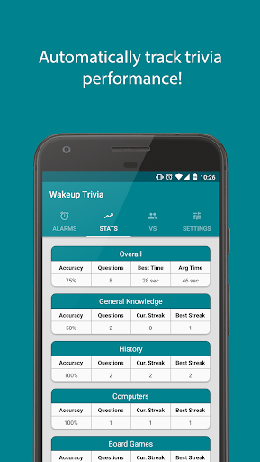 » Want to keep track of your trivia performance? Wakeup Trivia automatically tracks how you're doing overall and within each category. Just check out the Stats page.