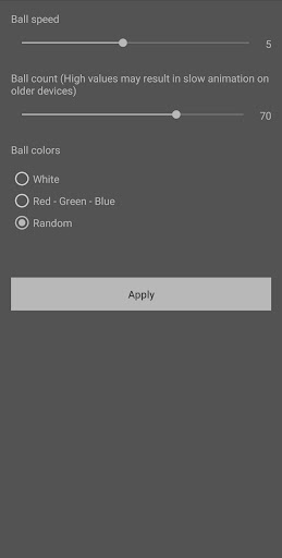 Wallpaper of colorful balls bouncing around your screen! Change their colors, movement speed and have as few or as many as you like on your home screen!