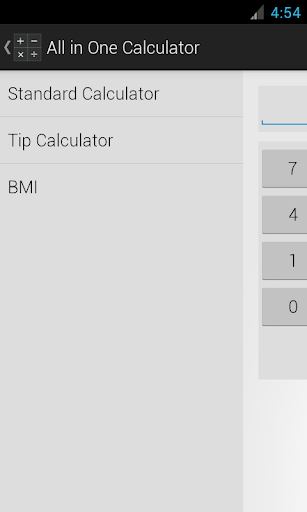 Multiple calculators including a standard calculator, a tip calculator, and a BMI calculator. Utilizes the SlidingMenu library from https://github.com/jfeinstein10/SlidingMenu.