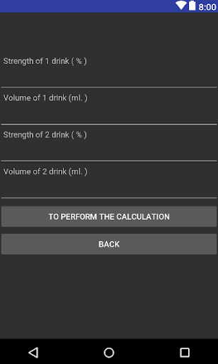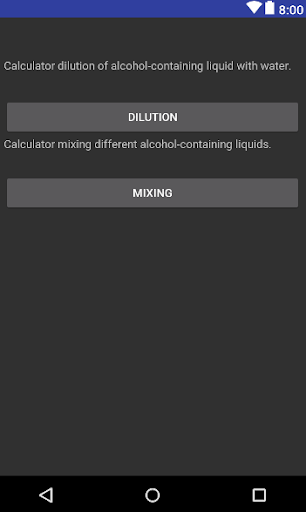 Easy-to-use calculator that will help every moonshine. No unnecessary functions, only the most necessary. Determines the required amount of water to dilute alcohol containing liquids, and calculates the percentage of alcohol content in various strength beverages.