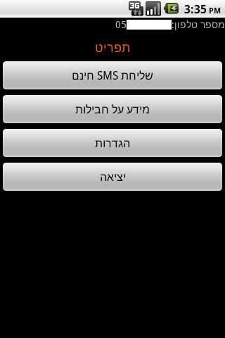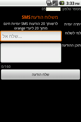 Send free SMSEasy, simple and convenient Simply enter your account information from your cell phone company website and enjoy the application. Free version The application allows you to send free SMS.Saves the message you sent, in your messages historyas if you sent your SMS app. accurate reports are not avilable right now The application also gives you accurate reports on the packages situation. allowing you to avoid payment of a fine. accurate reports are not avilable right now Please note the data to pull and or send the application are only from the cellular company site. If the site operator is not available or parts of it are not available, you cannot get this data. In this situation the data will not be displayed when you access the company website operator manually through the browser Note: We do not represent the cellular companies, not in any connection with them and do not retain any information about the customer.Did you like the application ?We will be happy if you rate it and leave it in the reviews Market.If you are experiencing any problems, we will be happy if you send us an email about it.topdroidapps@gmail.com If you still do not have an account Create an account at the cellular company. Meanwhile, customers of Orange IL alone. The app need internet connection to work.KW: Tariff Watcher Widget, 3g, 3G Watchdog, Data counter , Data counter , PhoneUsage, Call Meter, APNdroid, MY ORANGE, DROIDSTATS, STATS, HeyWire, Free sms sender WebSMS, SMS, messaging, , , MYORANGE, SMS , SMS