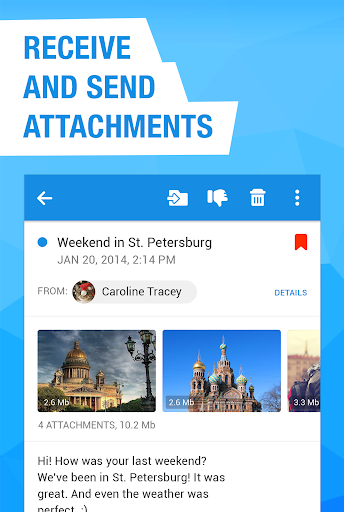 Send and receive mails. Share photos and documents. Learn about new messages almost instantly thanks to push-notifications. Configure the time, folders, and services for which you want to receive notifications. Personalized spam filter will protect you from annoying bulk mail.