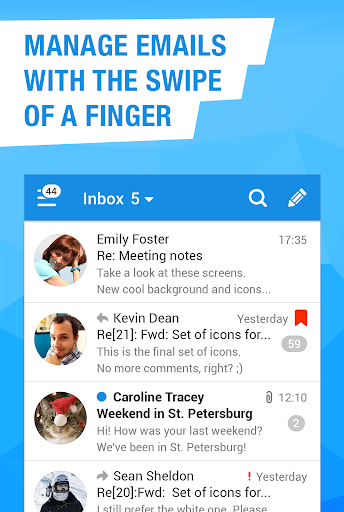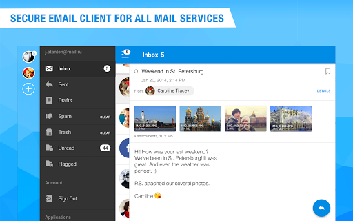 A snappy and easy-to-use mail app that supports multiple Mail.Ru, Gmail, Yahoo!, Hotmail AOL, iCloud, Hotmail, Outlook, GMX and any other IMAP or POP3-enabled mailboxes!