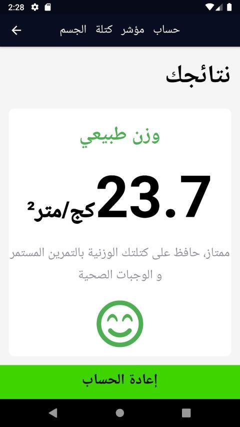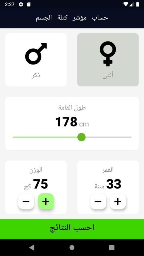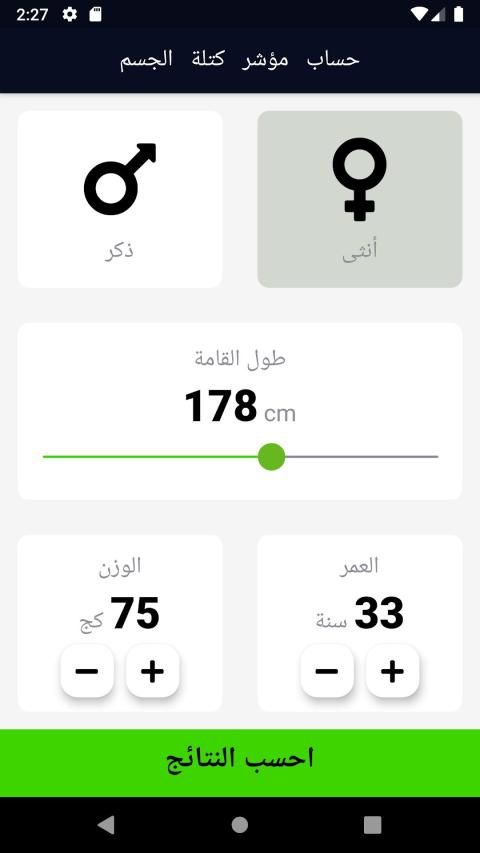 هذا التطبيق يمكنك من الحصول على الجسم المثالي و ذلك بمراقبتك لمؤشر كتلة الجسم. مؤشر كتلة الجسم المقياس المتعارف عليه عالميا في القياسات الجسمية لمعرفة إلى أي فئة ينتمي إليها المستعمل.