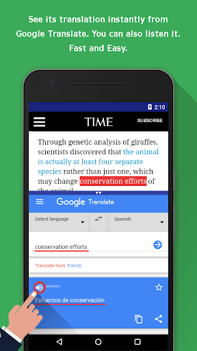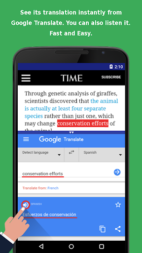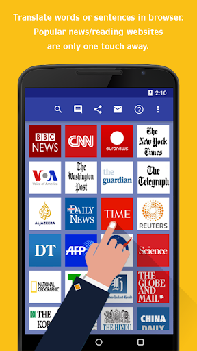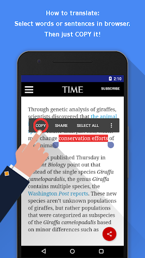1. Instant translations in browser, simply select the word and touch copy! Translate words or phrases instantly, read web pages, news, articles, magazines, economics, sports news, texts with this useful browser.