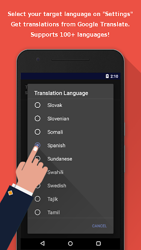 5. Supports all languages on Google Translate: Afrikaans Albanian Amharic Arabic Armenian Azerbaijani Basque Belarusian Bengali Bosnian Bulgarian Catalan Cebuano Chichewa Chinese Corsican Croatian Czech Danish Dutch English Esperanto Estonian Filipino Finnish French Frisian Galician Georgian German Greek Gujarati Haitian Creole Hausa Hawaiian Hebrew Hindi Hmong Hungarian Icelandic Igbo Indonesian Irish Italian Japanese Javanese Kannada Kazakh Khmer Korean Kurdish (Kurmanji) Kyrgyz Lao Latin Latvian Lithuanian Luxembourgish Macedonian Malagasy Malay Malayalam Maltese Maori Marathi Mongolian Myanmar (Burmese) Nepali Norwegian Pashto Persian Polish Portuguese Punjabi Romanian Russian Samoan Scots Gaelic Serbian Sesotho Shona Sindhi Sinhala Slovak Slovenian Somali Spanish Sundanese Swahili Swedish Tajik Tamil Telugu Thai Turkish Ukrainian Urdu Uzbek Vietnamese Welsh Xhosa Yiddish Yoruba Zulu.