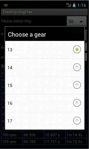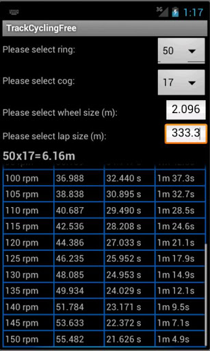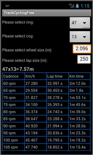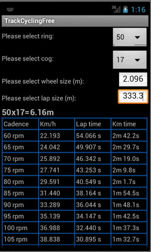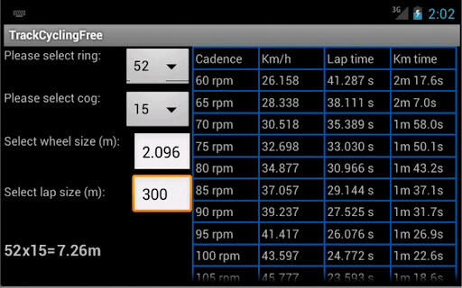 Select your track bike's gear, wheel diameter (2.096m by default ) and the velodrome diameter and it calculates the speed at different cadences.