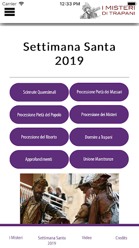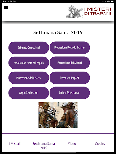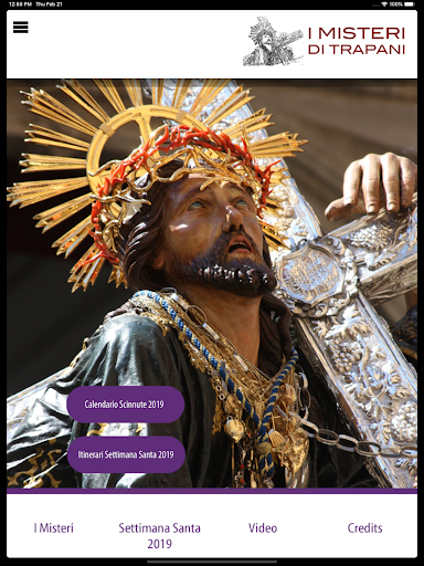 ANCHE PER ANDROID iMisteri - La prima app gratuita sulla Processione dei Misteri di Trapani, la più bella e più caratteristica processione del Venerdì Santo in Italia. Diciotto Sacri Gruppi e due simulacri che percorrono per ventiquattro ore, le vie della città siciliana, città di mare, dove le tradizioni vivono radicate dentro la maggior parte dei cittadini. Questa app, oltre ad essere descrittiva, fornisce anche l'itinerario 2019 della processione e il calendario degli appuntamenti quaresimali, più una raccolta di video esterni sulla processione e approfondimenti vari.