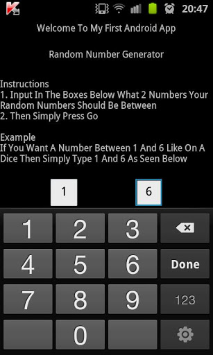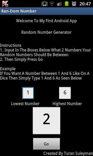 A Simple Small Random Number Generator. No Adverts. Doesn't Take Up Space. Doesn't Slow Your Device Down. Simply Pick What 2 Numbers They Should Be Between And Away You Go.