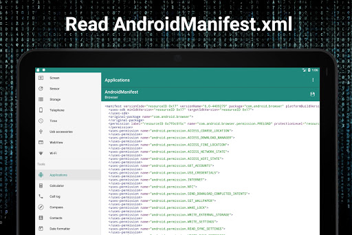 • Manifest viewer - list of apps, details, AndroidManifest.xml, extract SDK, calculate checksum...