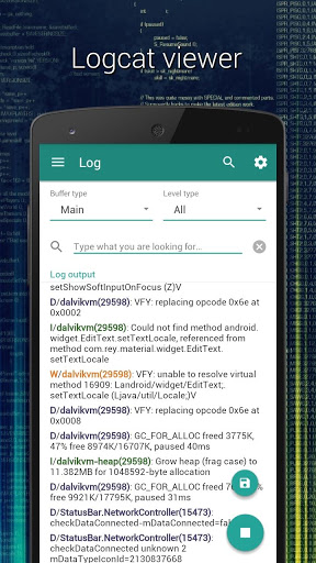 • Log - log output, search, save, main/radio/events, All/Debug/Info/Error/Verbose/Warn