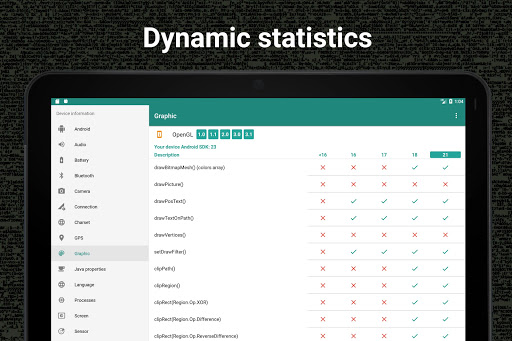 • Screen - pixel checker, brightness control, width-height, metrics info, refresh rate, rotation state, size