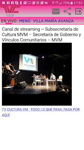 Con nuestra aplicación instalada en tu móvil podrás acceder de forma ágil y fácil a la transmisión en vivo de TV CULTURA VM, con una variada programación de eventos culturales y noticias de la ciudad de Villa María, además de programas como Cine Cultura, Entrevistas en vivo, programas completos de Dúo x la Vida TV, programas para niños producidos por Tecnoteca TV y mucho más.