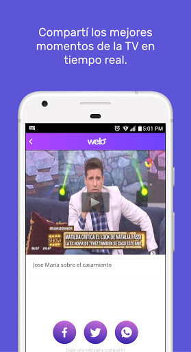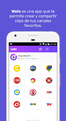 Welo es una aplicación gratuita que permite crear clips de TV en tiempo real y compartirlos con tus amigos en Facebook, Twitter y Whatsapp. Puedes seleccionar cualquier segmento que hayas visto en TV hasta 1 hora para atrás y crear clips de hasta 30 segundos.