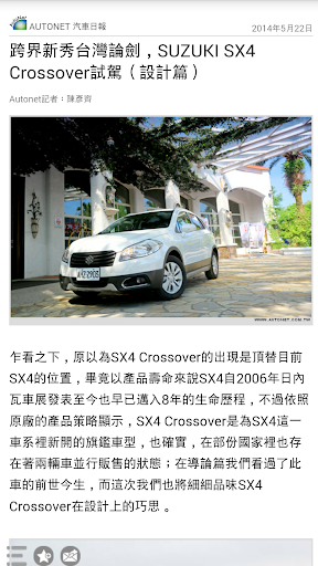 秉持著提供車迷更多元且即時的訊息,推出SUZUKI News App,不定時更新第一手最熱門有關SUZUKI汽車品牌的相關訊息與新聞,讓喜愛的SUZUKI品牌的車迷朋友能夠掌握任何的最新動向,不只方便瀏覽,更可建立個人書籤,並透過Mail即時分享給同好、好友。結合智慧型手持裝置的便利優勢,結合影音、導航、電子書等豐富功能,提供據點查詢、車款型錄、專題報導等品牌相關資訊,滿足車迷們對於SUZUKI品牌所有知性的需求。