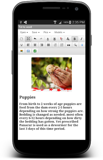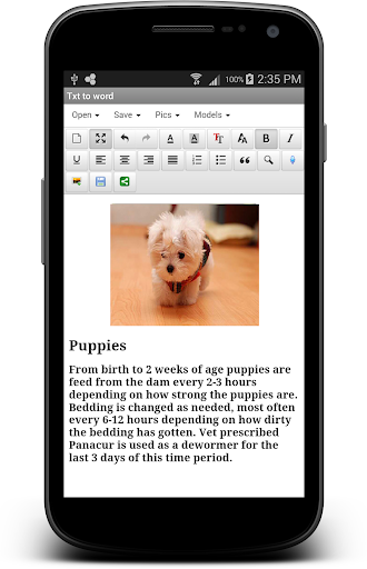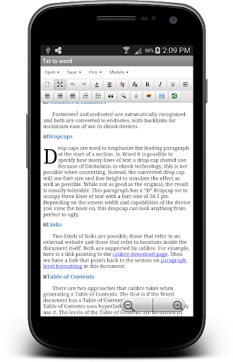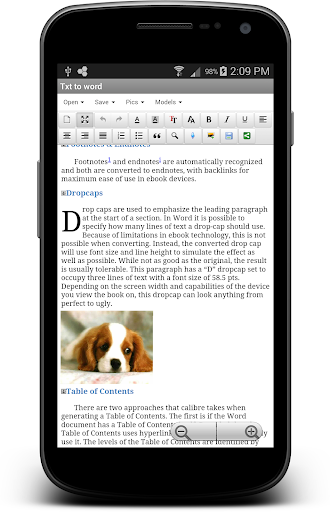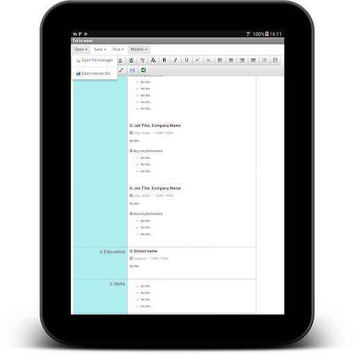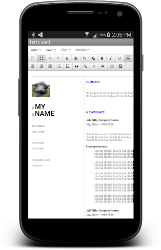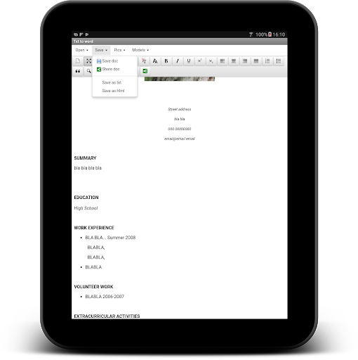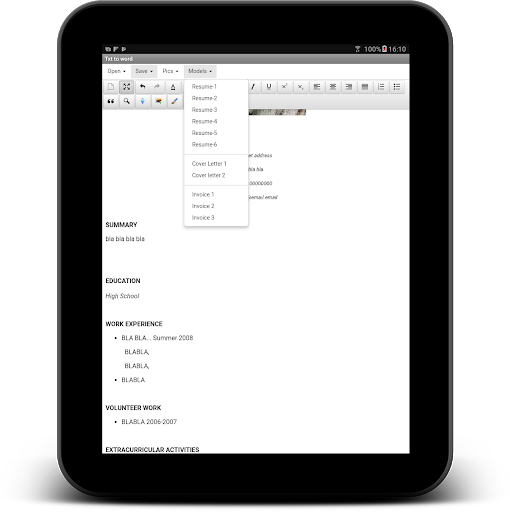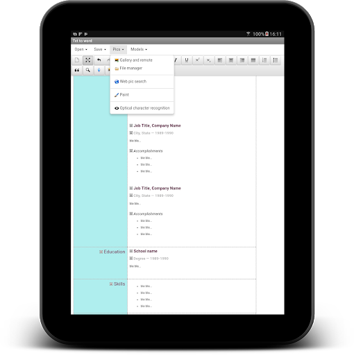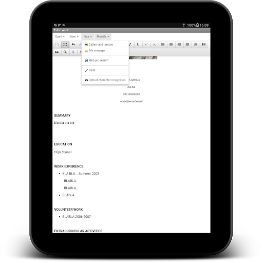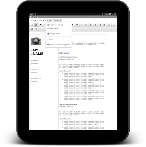 Create or modify DOC , DOCX , RTF , ODT , HTML , TXT.Documents manipulation, change styles font and colors, insert pictures , optical character recognition and PDF converter. Resumes ,invoices and cover letters templates availables. Sign your documents using paint option.