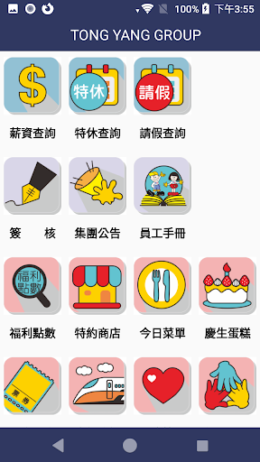 『TYG APP』提供企業內部員工以手機等行動載具,可隨時隨地進行相關公司作業,以達到高效率的企業行動辦公室。 員工可在行動平台上進行簽核作業及可查詢集團公告、今日菜單、個人福利點數等資訊。