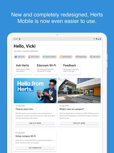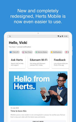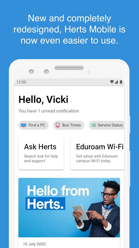 Herts Mobile, the app for University of Hertfordshire Students, Staff and Visitors.