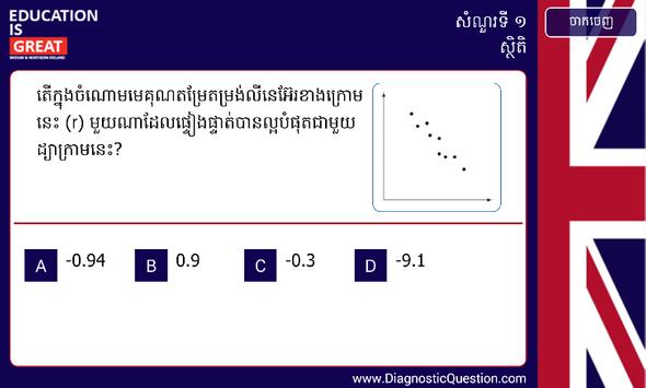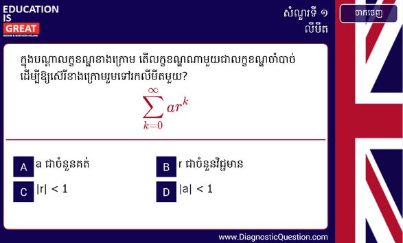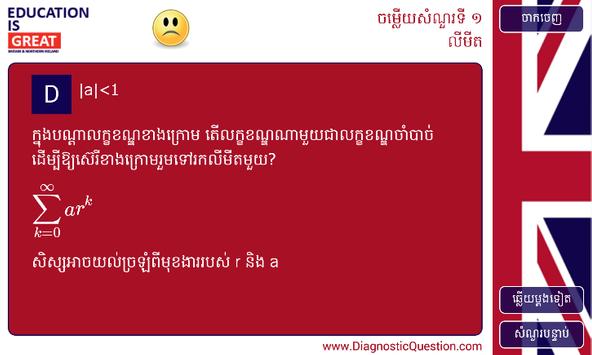This app includes 100 diagnostic questions based on the Cambodian grade 12 maths curriculum that have been produced by Craig Barton, the inventor of Diagnostic Questions.