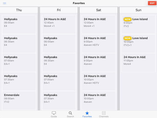 You can search My Telly's complete UK TV Guide to find out when your favourite TV shows are on this week and add your most watched programmes to a favourites list.