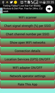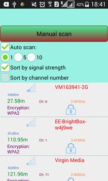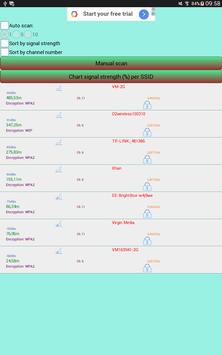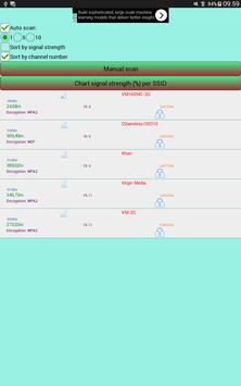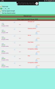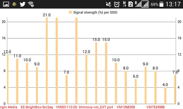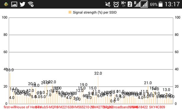 - a chart of signal strength (%) per SSID (WiFi network name) allows you to zoom in and zoom out.