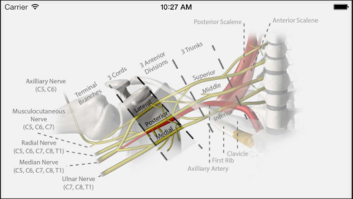 A tab system gives the user access to anatomy, procedure, tips and equipment. The anatomy tab gives an overview of anatomy related to the specific block, it includes schematic diagram’s which can be expanded to full screen. The procedures tab is a full pictorial and text guide to the performance of the specific block, including annotated ultrasound screen captures to help visualise nerves. The tips tab contains useful advice related to the selected block, also included is advice on the use of ultrasound and local anaesthetics.