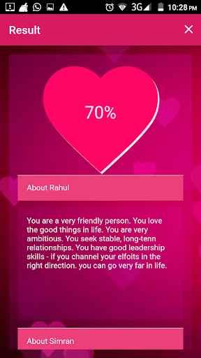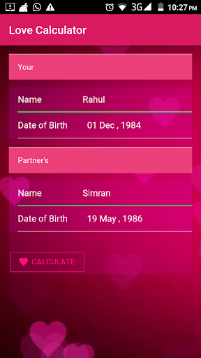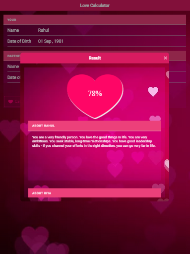 This app is the best among other available apps in the play store. In Love Calculator you will get calculated results, not any random value, your date of birth and name will be analyzed by the numerology.