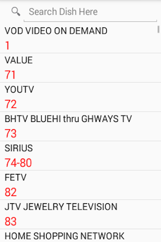 Ok. I developed this app for my personal use. But I have had so many request for it that I decided to put it in the Google Play store. When you travel, have you ever wanted something to tell you what channel your station is on? Well here is the solution. Let me start off by saying. This app will NOT tell you what tv shows are coming on. It is not a program guide. It is a simple app that lets you search for a channel. For example. Say you are traveling and you would like to know what channel tvland is on. You just start typing tvland and it pops up with the corresponding channel number for dish or directv. That's it. Let me add: I tried to make sure that all the channels are current. But if you find any errors please send me an email and I will update the changes in the next update. This app does not include local channels. It is just a simple app that will quickly give you the channel for the most common used stations for dish and directv. Music channels are included. Enjoy.