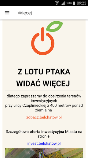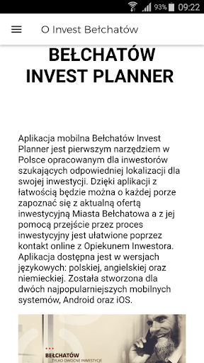 Aplikacja mobilna Bełchatów Invest Planner jest pierwszym narzędziem w Polsce opracowanym dla inwestorów szukających odpowiedniej lokalizacji dla swojej inwestycji. Dzięki aplikacji z łatwością będzie można o każdej porze zapoznać się z aktualną ofertą inwestycyjną Miasta Bełchatowa. Z jej pomocą przejście przez proces inwestycyjny jest ułatwione poprzez kontakt online z Opiekunem Inwestora. Aplikacja dostępna jest w wersjach językowych: polskiej, angielskiej oraz niemieckiej. Została stworzona dla dwóch najpopularniejszych mobilnych systemów, Android oraz iOS.