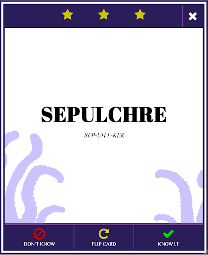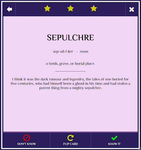 Flashcards containing vocabulary used by H.P. Lovecraft throughout his short stories and novels. While reading authors with extensive vocabularies it is common to stop in order to look up an unknown word. Some authors, such as H.P. Lovecraft, have such a large vocabulary that it is necessary to interrupt yourself so often that you lose focus and the story becomes less colorful. Using this app you will be able to master his most common but difficult words to give yourself a fluid reading experience.