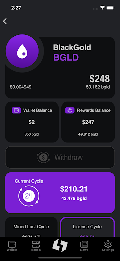 From the mobile app you can see your rewards, withdraw them, transfer your tokens on the wallet, manage your boxes, and keep up to date with the latest news!