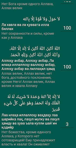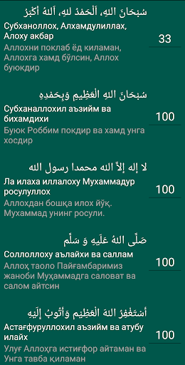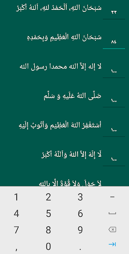 - There are 10 different dhikr. There is an option to choose a comment from the Arabic or Latin script. You can set the number of dhikr yourself.