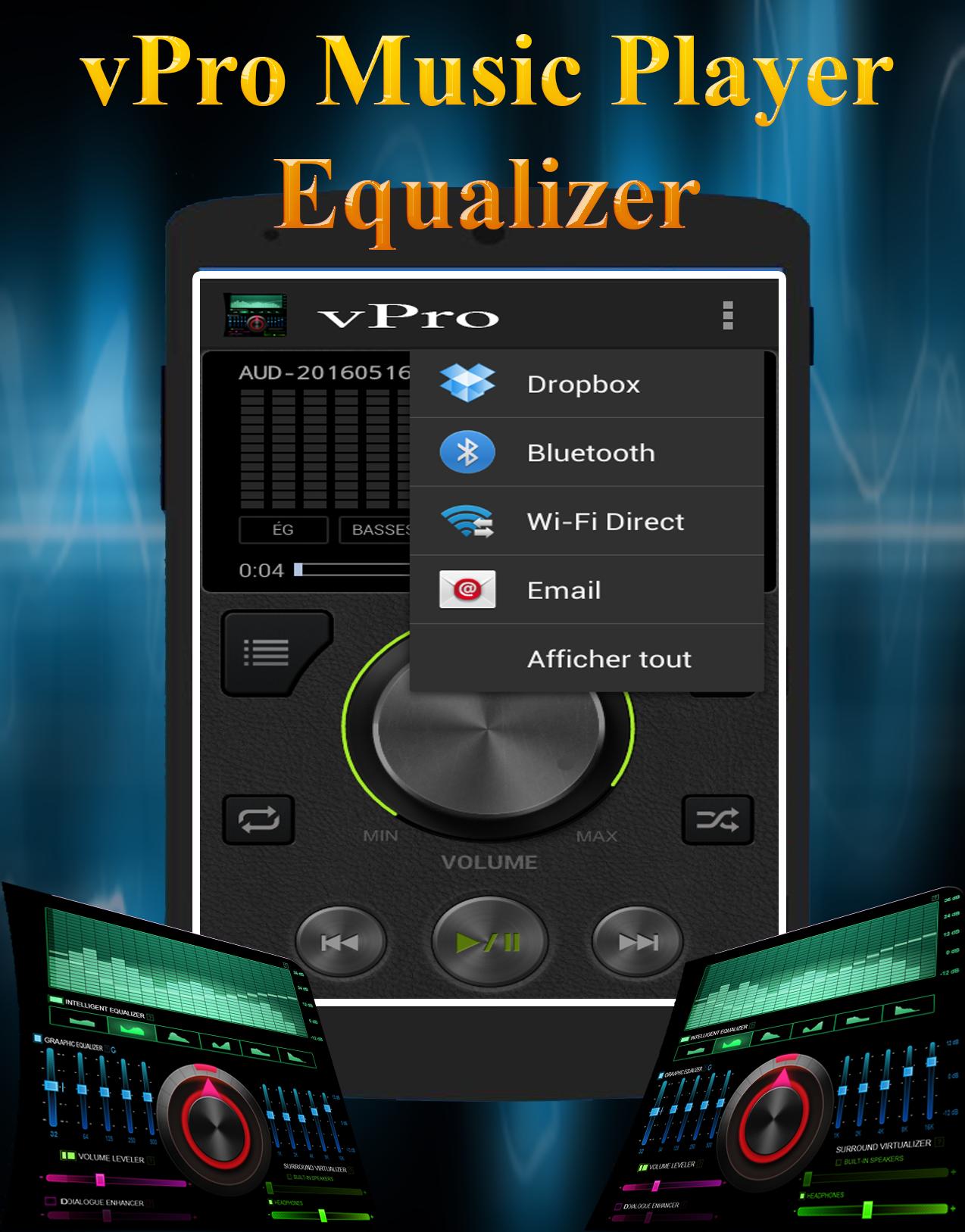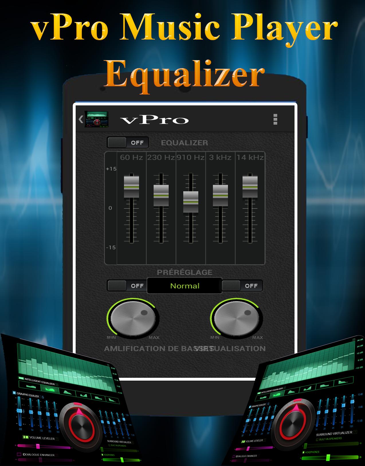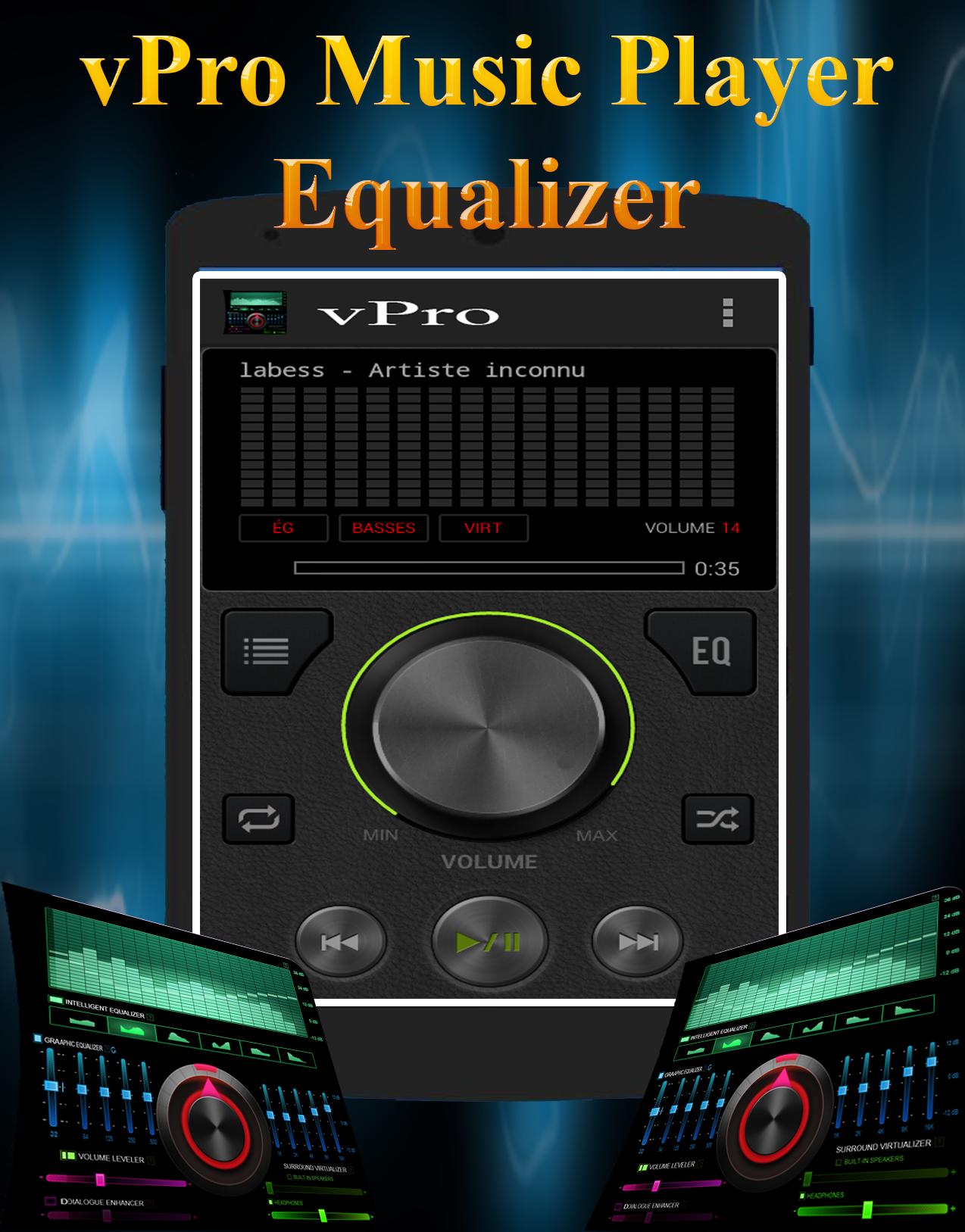 vPro Music Player Equalizer Listen to the right music, wherever you are. with powerful equalizer, Quick search all music files, custom background skin, free to get this perfect audio player and media player.