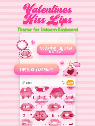 Hi pink keyboard fans, new stylish & trendy themes are released regularly to let your keyboard always stand out! We know how much you like Valentines Kiss Lips Keyboard Theme to beautify your mobile gadget and that is why we created Valentines Kiss Lips Keyboard Theme! Now you can adorn your keyboard cover with some cute Valentine stuff while sending love messages, or chatting with your best friends.