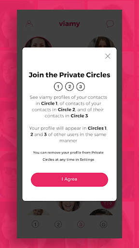 In viamy Dating App you have the General circle with all viamy users nearby and worldwide. After registration you have the option to join to the viamy unique Private Circles and to see viamy profiles of your phone contacts in Circle 1, of phone contacts of your contacts in Circle 2, and of their phone contacts in Circle 3.
