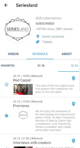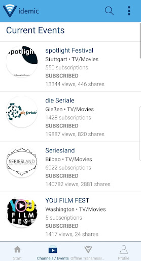 Watch the event schedule and trailers, case studies or other videos in the channel of a festival and choose your favorites. Thus, you can individually plan your participation in the film or music festival or the conference.