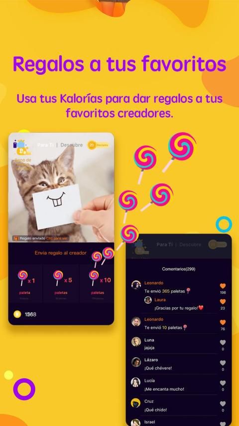 Gana And win! Record short videos, add your favorite memes, share videos of your life, play scratches, or participate in our social network. And we give you Kalories! Save them for future prizes!