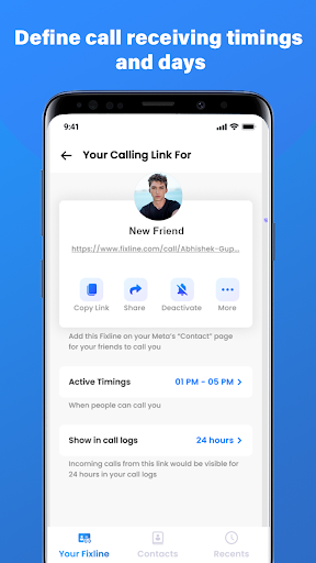 Fixline Calling App is World's first calling app that doesn't require a phone number. It uses call links to make local as well as international free call. All you need is the internet or wifi to call! You can create and customize multiple call links for different purposes, say work, dating, family, etc. Additionally, you can set timings for the activation of each link and manage disappearing call logs.