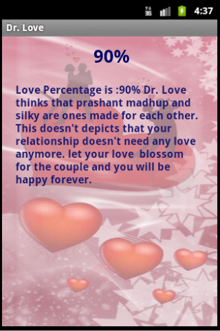 Dr Love measures love compatibility of two people.just put in your name and name of loved one and Dr.Love check the chance of a successful romantic relationship.