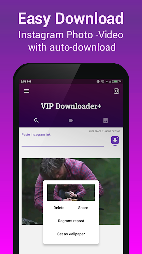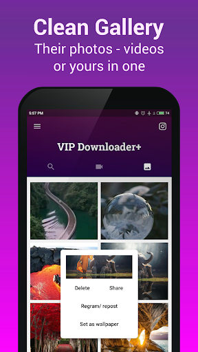 Wanna download and save Instagram videos and photos, and browse them offline anytime to save bandwidth? Never been easier. Get VIP Downloader, the tiny photo video downloader for Instagram. With this app, you can save Instagram video, share, regram/ repost Instagram, or set them as Instagram wallpaper easily.