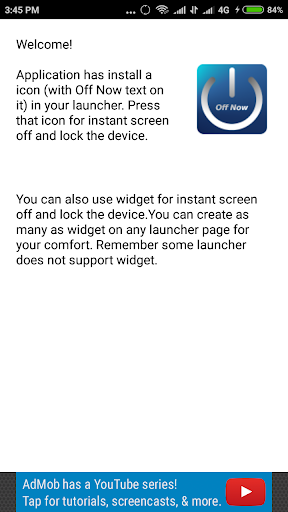 a icon with off now text will install in your home screen. When user press this icon device screen will off and lock instantly. You can create widget (if launcher support) for comfort.