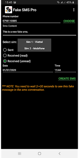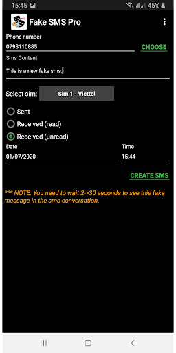 With Fake SMS Pro, you can create free fake SMS from your friends, your family,... You can choose the sim, the date/time, the sms types: Sent, Received (read), Received (unread),...