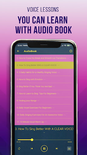 Are you a beginner, intermediate or professional singer? Voice Lessons present a variety of knowledge, techniques, and tips for those of you who want to develop talent in singing. Whether you're doing it just as a hobby, to prepare for a singing talent competition, or you want a serious career in singing. This app is perfect for you because it is easy to use and provides complete media for you to learn.
