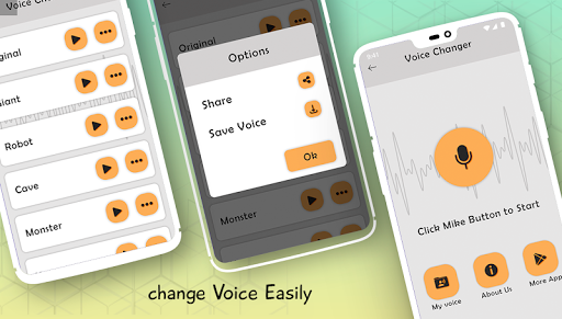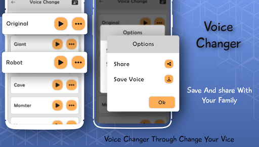 This app is application change your voice. This application will help you can change voice that you recorded or change file music which exist in your device. You can change your voice to other funny voice, as: change to men’s voice, women's voice, bee's voice, baby’s voice, robot’s. You need only go to our application and select voice or music file which you want to change, then you can listen voice after change and save voice after changed if you want.